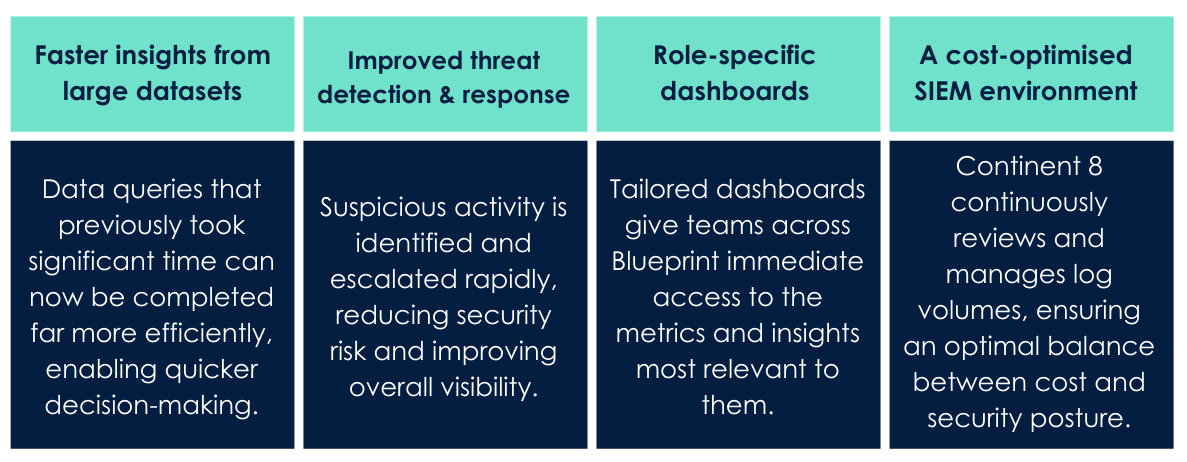 “Blueprint required strong security oversight without adding operational burden to a lean internal team. Our Managed SOC service was designed to deliver exactly that – improving visibility, accelerating threat detection, and optimising log volumes while maintaining a robust security posture. The result is a scalable, cost-efficient security capability aligned to the realities of a high-risk, data-intensive environment.”